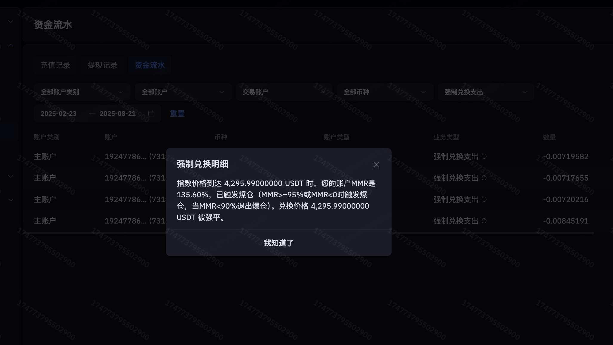 Your forced liquidation orders can be viewed in your fund flow; filter "Forced Exchange Expenses", "Forced Exchange Income", and "Liquidation Fees" to filter out transaction records for spot debt repayment and contract forced liquidation.