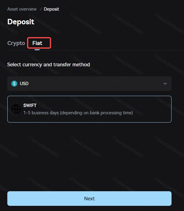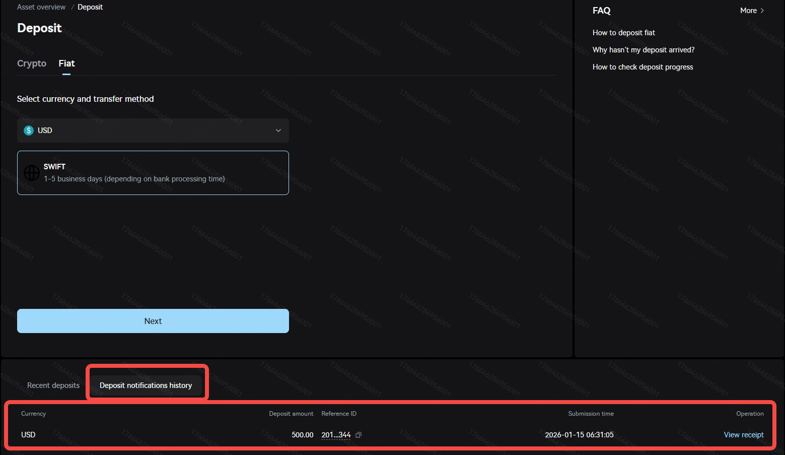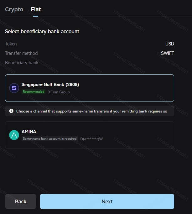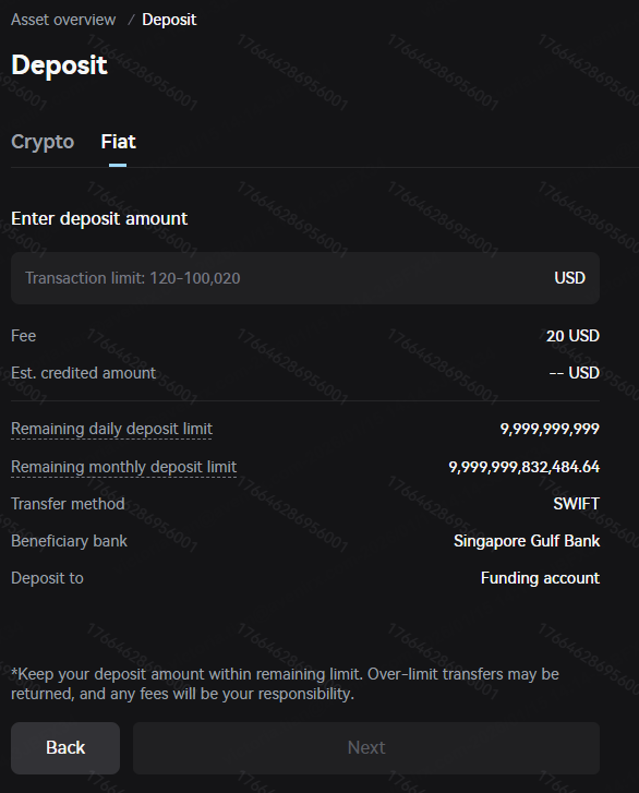Enter the "Fiat" deposit page. Select the currency, payment method, and beneficiary bank from the drop-down menu, and then enter the deposit amount. For example, in the image below, you select USD, use SWIFT transfer, choose Amina as the beneficiary bank, and enter a deposit amount of 500 USD. Complete remittance information for the receiving account will then appear.