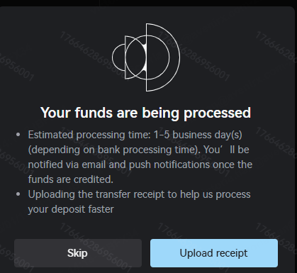 If you click the left button "Skip" directly on the "Upload receipt" pop-up window, the system will not redirect you to the "Upload receipt" page, and the deposit will not appear in the "Deposit notifications history". If you need to upload the bank receipt or hope to view the deposit notifications history that has been initiated, please repeat steps 2 and 3 above. However, please note that you should not repeat the bank transfer process. You only need to log in to online banking or mobile banking, obtain the bank transfer receipt, and upload it to the Xcoin platform.