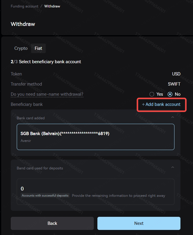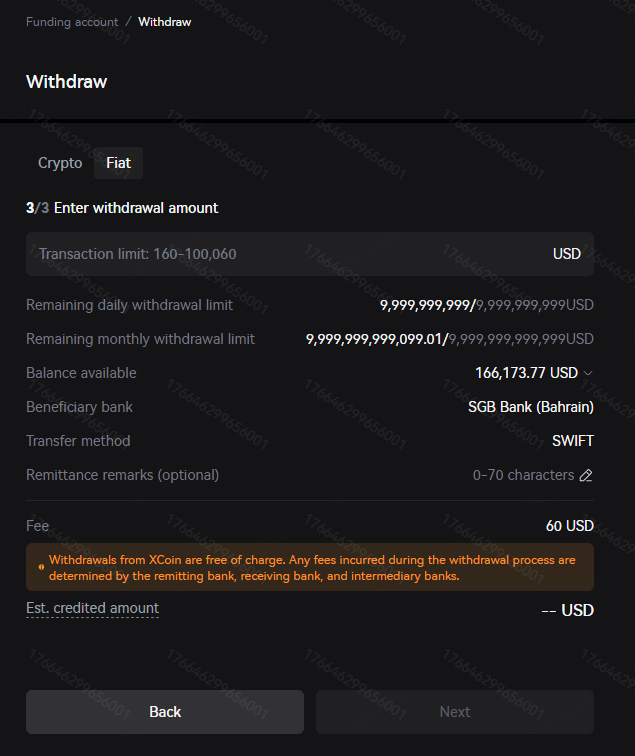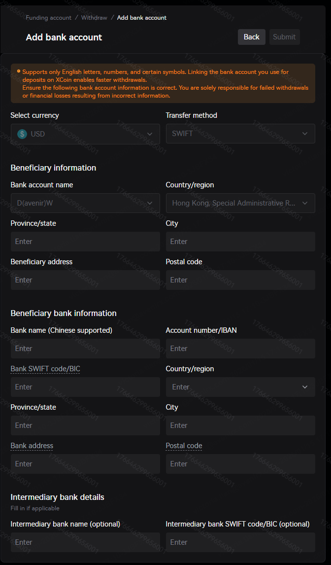 Enter the "Fiat" withdrawal page, and select the currency, withdrawal method, and beneficiary bank account from the drop-down menu. When making your first withdrawal or withdrawing to a beneficiary bank account that you have never used on Xcoin before, you need to click "+Add bank account" to bind the beneficiary bank account information. Please note that your beneficiary bank account must be a bank account that has been used for fiat deposits before! If you have never made a fiat deposit, please first initiate a fiat deposit from your bank account to the Xcoin platform. Only after the deposit is successful can the beneficiary bank account be used for withdrawals.