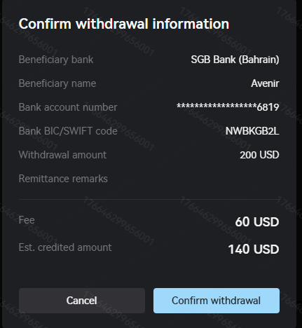 After clicking "Next," the page will again display the Beneficiary bank, Beneficiary name and Bank account number, Bank BIC, Withdrawal amount, and Remittance remarks. Please verify that everything is correct before clicking "Confirm withdrawal." To ensure the security of your funds, you will also need to enter the authenticator app and the 6-digit verification code received in your registered email address to complete the withdrawal order submission.