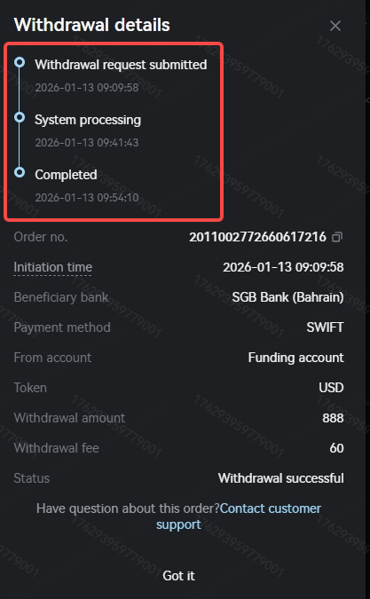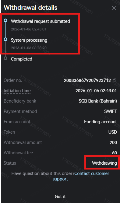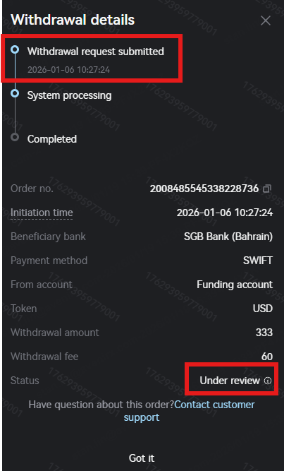 Your withdrawal order needs to be approved by the platform. Orders in the review process will show a status of "Under review". You can contact client service to check the review progress or request supplementary materials to pass the review.