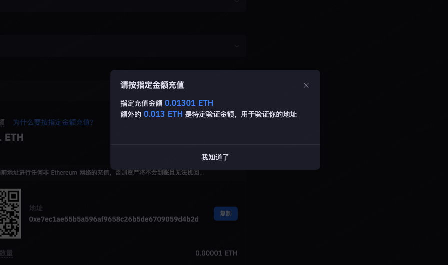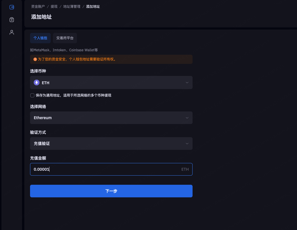 - 如选择“充币验证”,系统会生成一个指定金额,您需从目标钱包向平台指定的充值地址充值该金额,用于验证地址归属权。