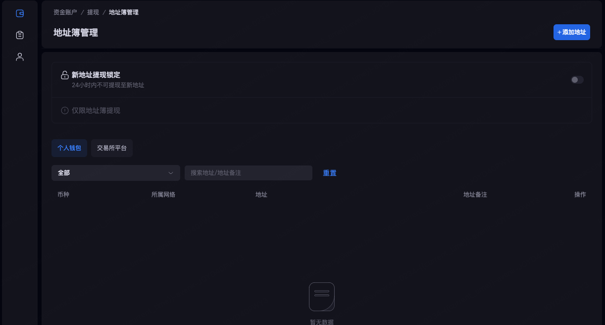 - 仅限地址簿中的地址可用于提现,添加新地址前请提前做好验证。