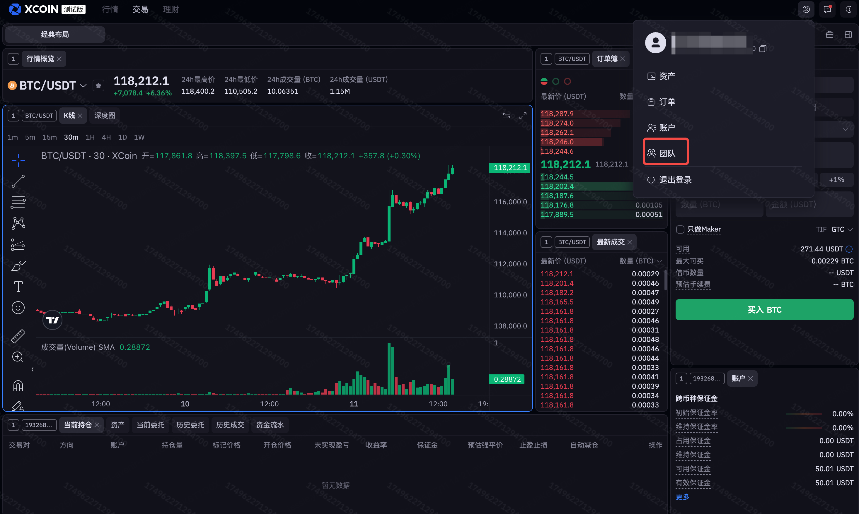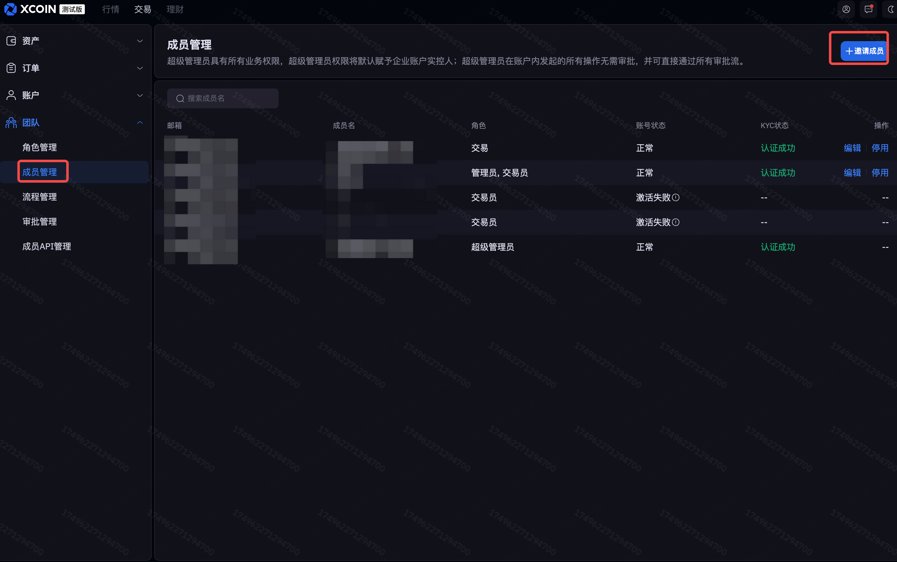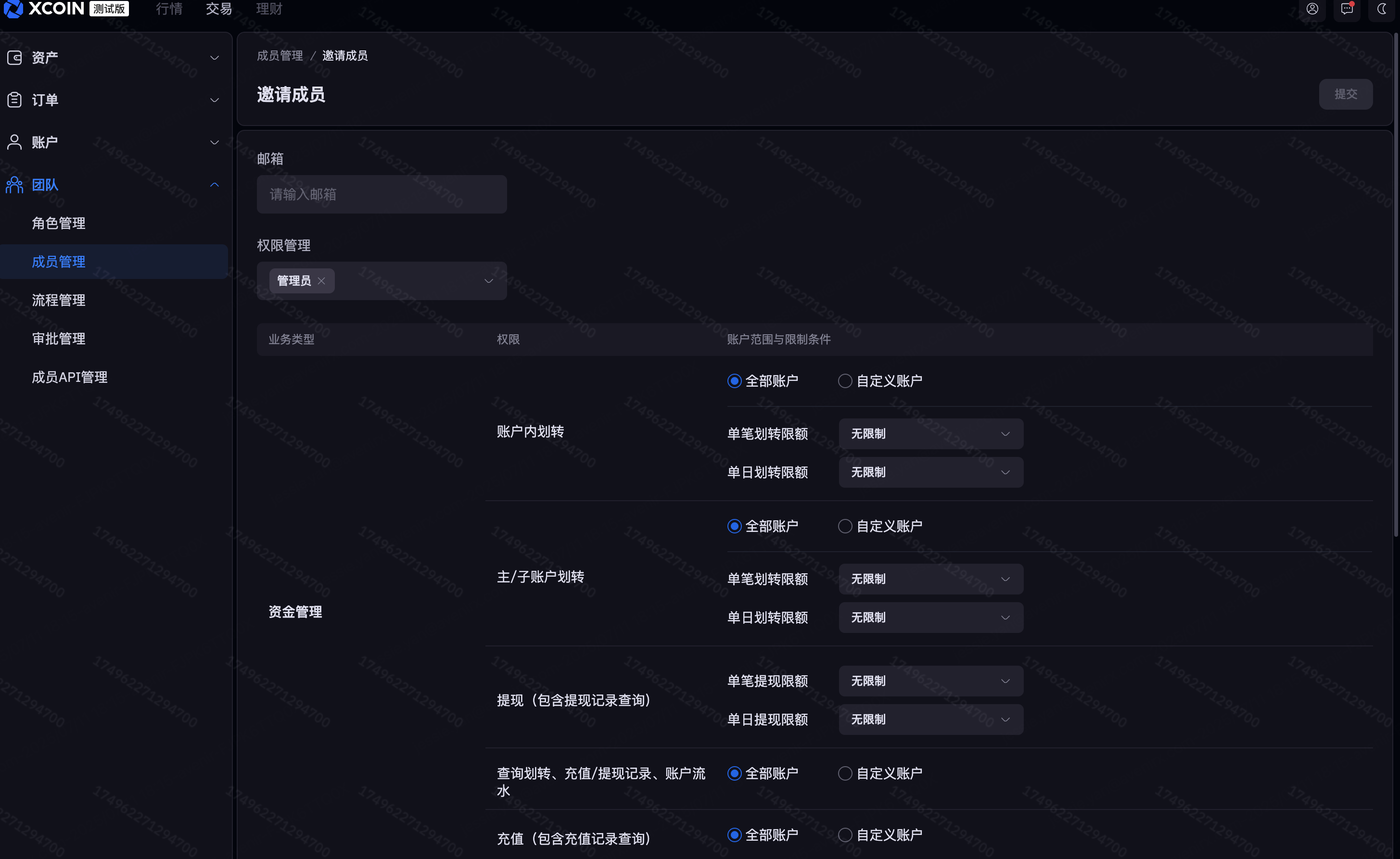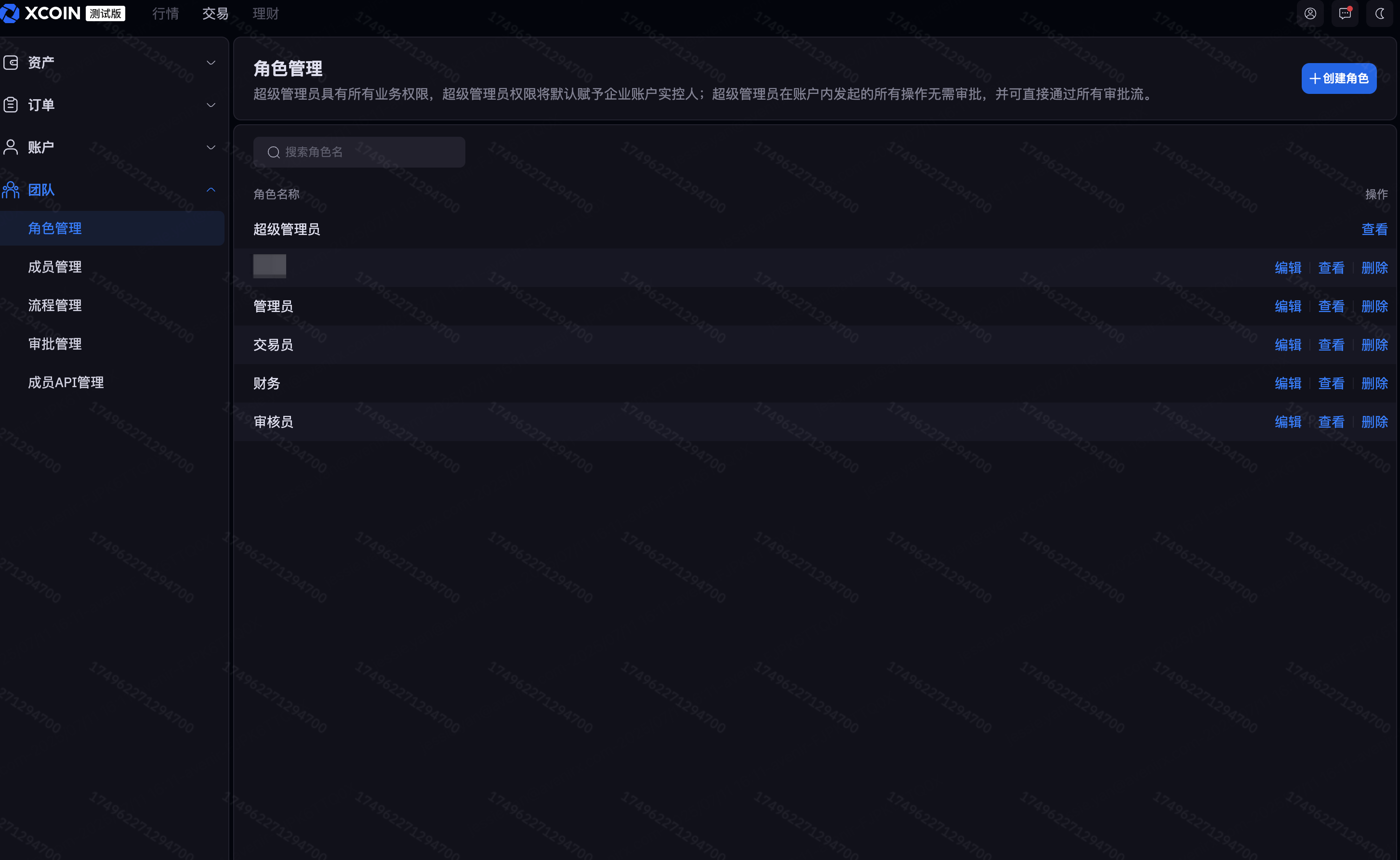 账户注册时默认登录是超级管理员,在超级管理员的个人中心里点击团队,进入团队管理中心,默认的角色有:超级管理员、管理员、交易员、财务、审核员、点击查看可以看到每个角色的权限,如不满足需求,可以编辑或者创新新角色