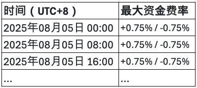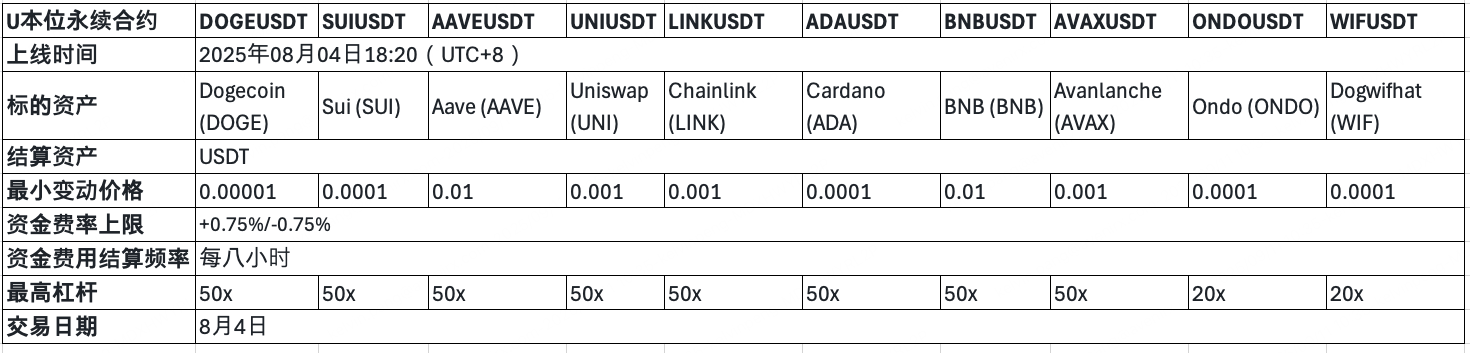 - DOGE、SUI、AAVE、UNI、LINK、ADA、BNB、AVAX、ONDO、WIFUSDT永续合约上线时,其资金费率上下限为+0.75%/-0.75%;