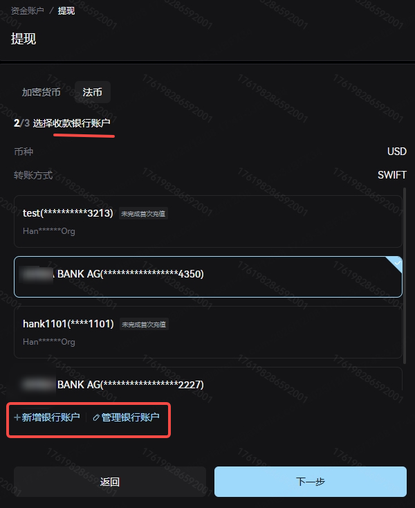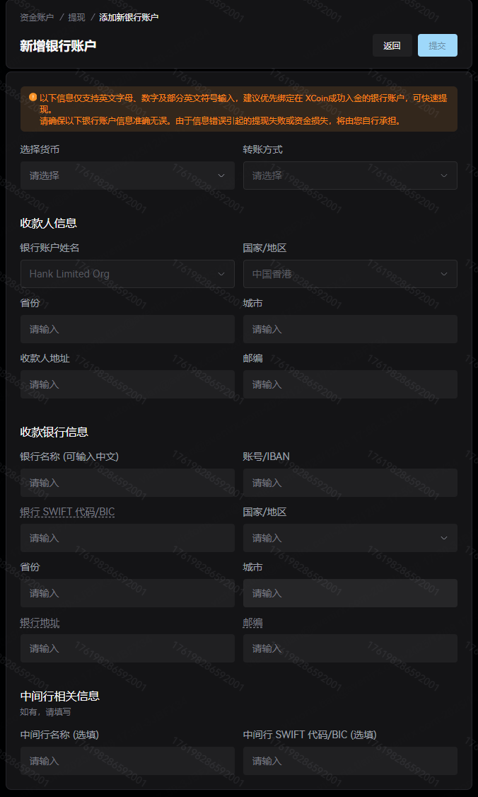 点击进入“法币”提现页面,依次从下拉菜单中选择币种、提现方式、收款银行账户。当您首次提现或者提现到从未在Xcoin使用过的收款银行账户,需要在点击页面底端的“新增银行账户”或者“管理银行账户”,绑定收款银行账户信息。请注意,您的收款银行账户必须是此前在法币充值中使用过的银行账户!若您从未操作过法币充值,请首先从您的银行账户向Xcoin平台发起一笔法币充值,待充值成功后,该收款银行账户方可以用于提现。
