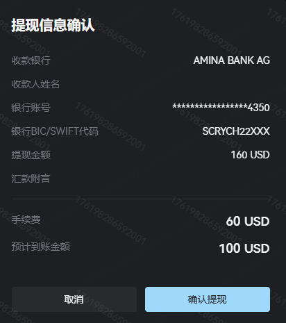 点击“下一步”后,页面再次展示收款银行及账号、收款人姓名、收款银行BIC、提现金额、汇款附言等信息,请您核对无误后再点击“确认提现”。为保证您的资金安全,您还需要输入验证器和注册邮箱收到的6位验证码,方可完成提现订单提交。